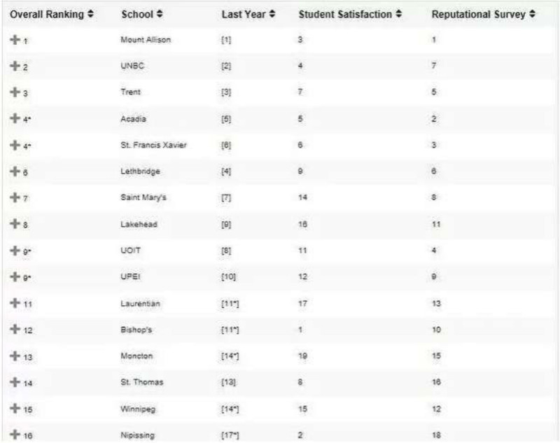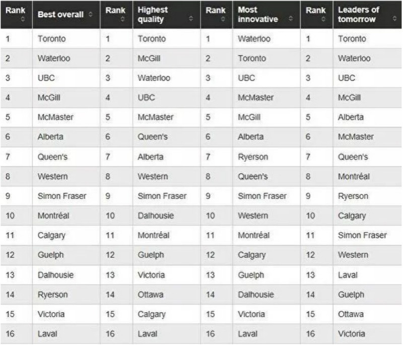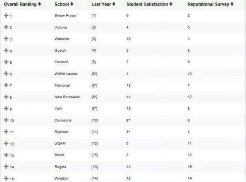 1.西门菲莎大学(Simon Fraser);2.维多利亚大学(Victoria);3.滑铁卢大学(Waterloo);4.圭尔夫大学(Guelph);5.卡尔顿大学(Carleton);6.劳瑞尔大学(Wilfrid Laurier University);7.纽芬兰纪念大学(Memorial);8.新不伦瑞克大学(New Brunswick);9.约克大学(York);10.康考迪亚大学(Concordia University);11.瑞尔森大学(Ryerson)。