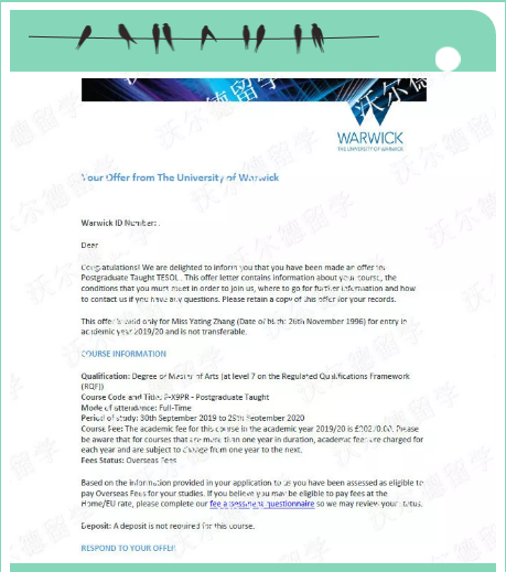 恭喜UIC张YT同学再获华威大学(TIMES综合排名第10位)教育类专业录取!