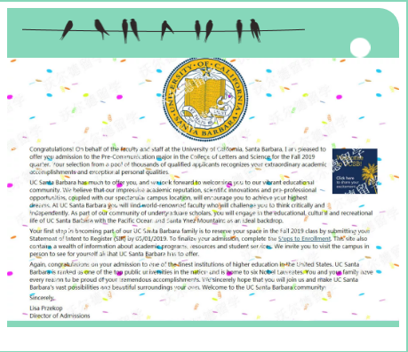 恭喜签约学生唐J同学获加州大学-圣塔芭芭拉(USNews综合排名第30位)传媒类专业录取!