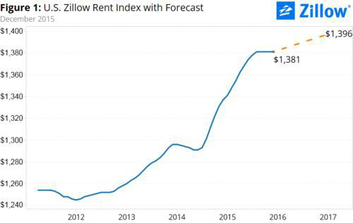 据《财政时报》(The Fiscal Times)和雅虎新闻报道,经过几年的不断上升,美国整体房租价格将在2016年稳定下来。Zillow的一项新预测显示,今年的平均租金价格将小幅攀升至1,396元,比2015年1,381元上涨1%。